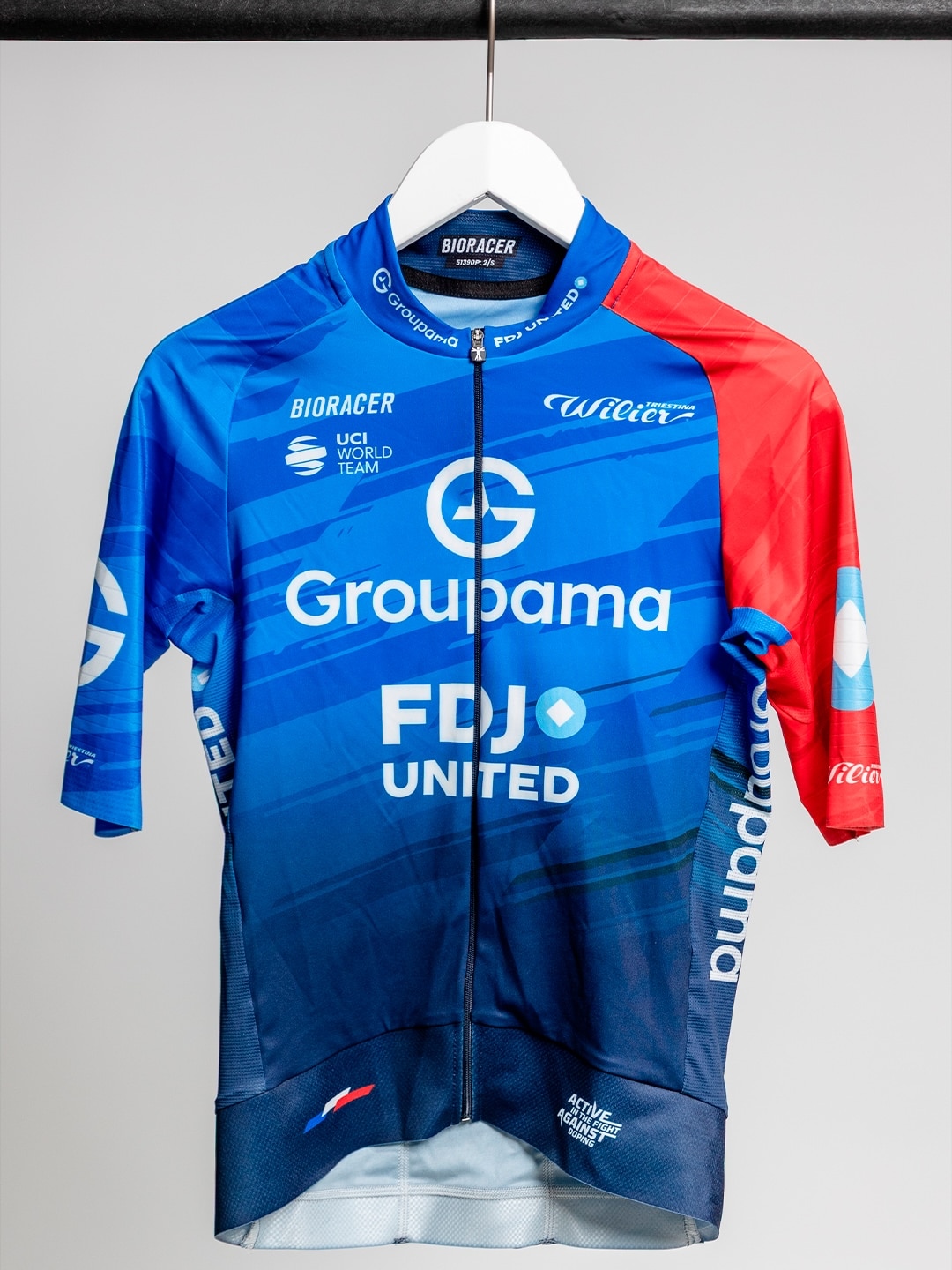 Le nom de l’équipe, Groupama-FDJ United, y est clairement identifié, accompagné du slogan “FDJ UNITED”. Un drapeau tricolore discret vient souligner l’ancrage national. Enfin, une mention engagée – “Active in the fight against doping” – s’inscrit sur la base du maillot, prolongeant les valeurs défendues par la formation.
