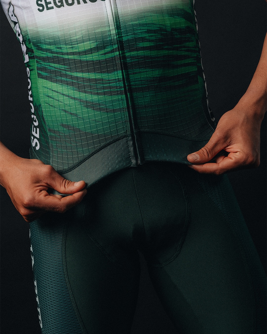 Le cuissard conserve sa teinte vert foncé, en parfaite continuité avec le maillot. Sans éléments superflus, il adopte une construction épurée : coutures minimales, absence de bande de maintien visible, sensation seconde peau.