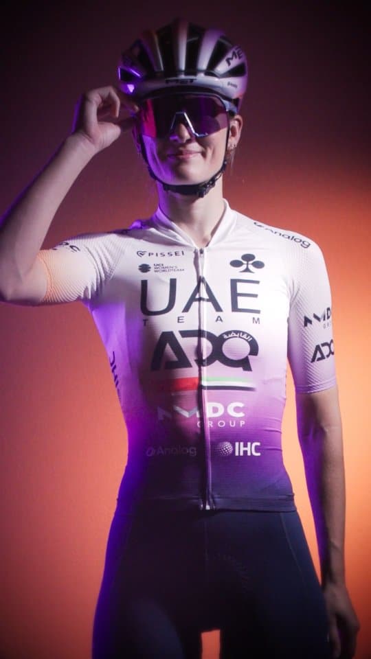 Ce dégradé incarne la transition, le mouvement et l’énergie, des notions qui résonnent avec l’évolution du cyclisme féminin. Plus qu’un effet visuel, cette palette fluide veut marquer les esprits et rendre la tenue facilement identifiable dans le peloton. À travers cette approche, UAE Team ADQ affirme une identité graphique forte, en phase avec l’image d’un sport en pleine transformation.