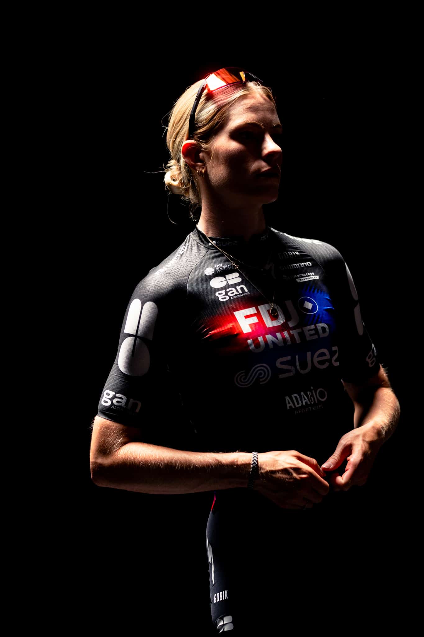 Le maillot “Burning Core” repose sur un fond noir profond. Ce choix représente le travail invisible des coureuses : entraînements difficiles, météo compliquée, solitude.