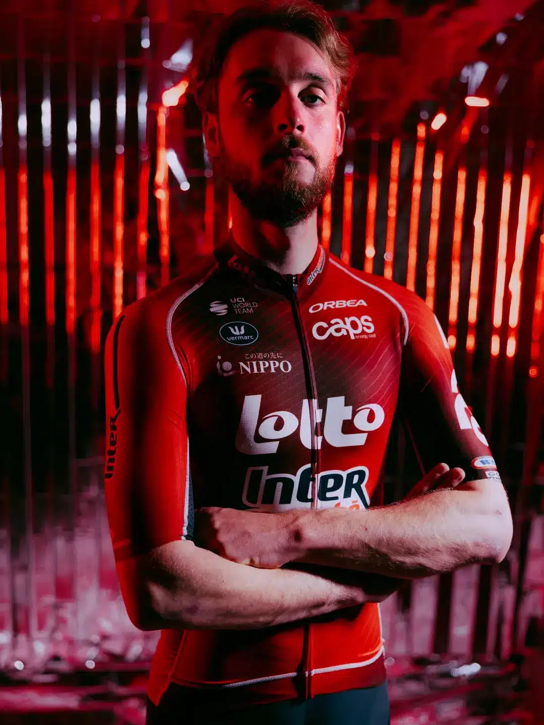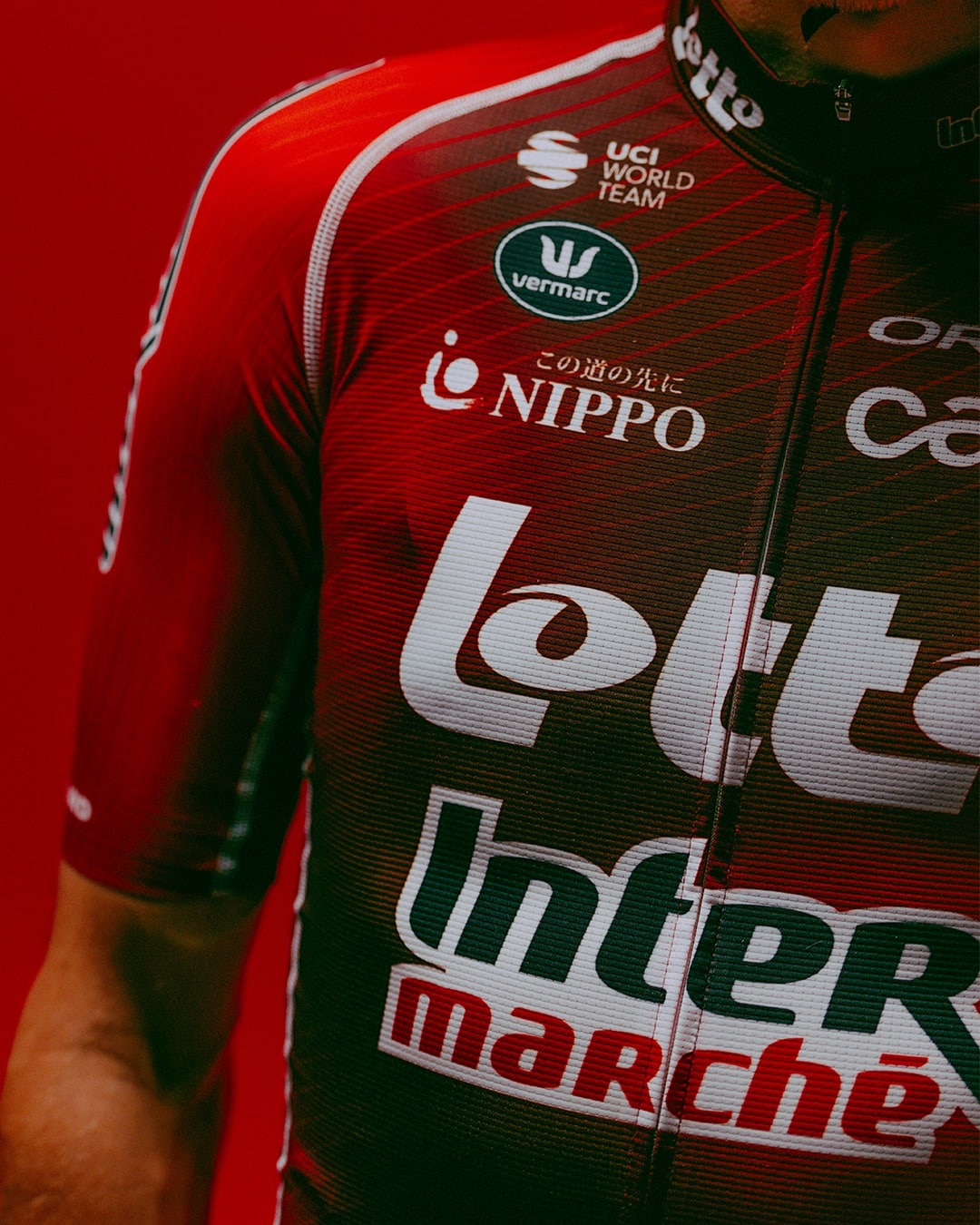 Pour sa première saison, Lotto–Intermarché conserve les codes visuels de Lotto. Le maillot 2026 affiche une teinte rouge légèrement assombrie, associée à du noir. Les couleurs vives d’Intermarché–Wanty disparaissent au profit d’un rendu plus sobre, pensé pour la lisibilité à l’écran et la continuité visuelle.