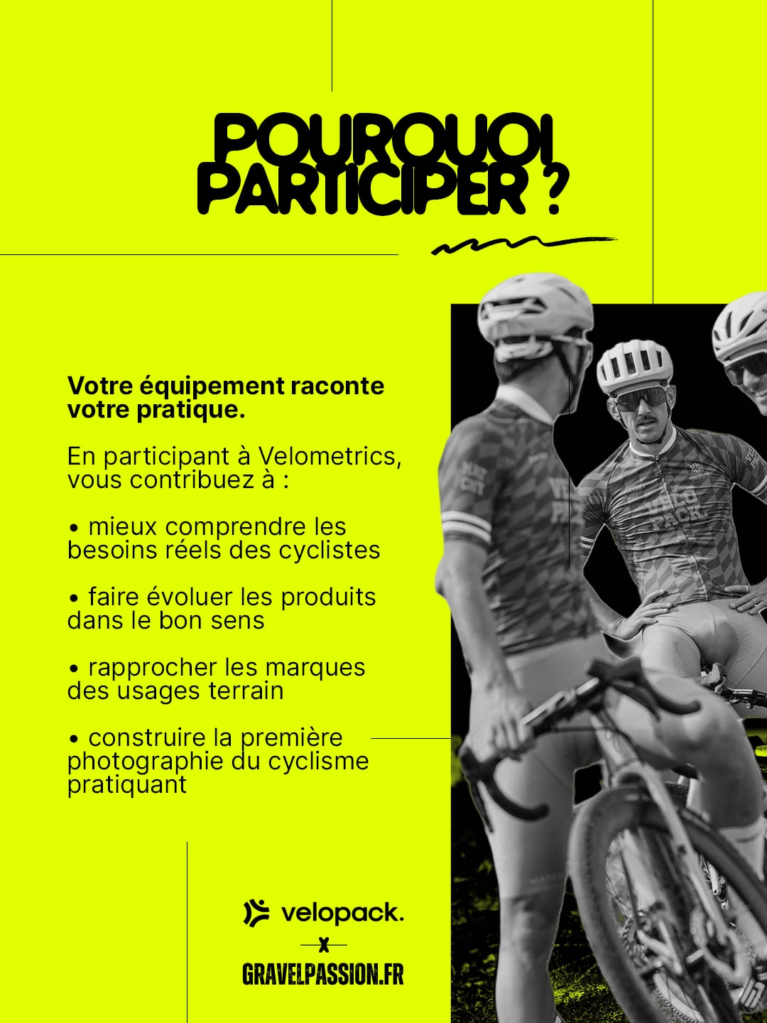 Le marché du cyclisme parle souvent de technologies, d’innovations ou de performances. Mais plus rarement des usages réels des pratiquants. Avec Velometrics, velopack et Gravel Passion souhaitent répondre à une question simple : comment les cyclistes s’équipent-ils vraiment aujourd’hui ?