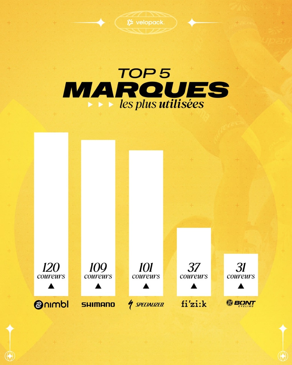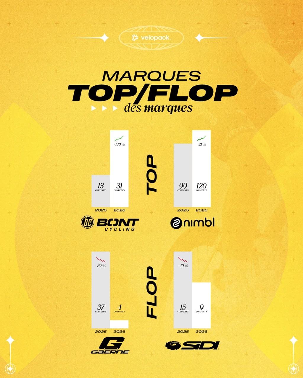 À l’inverse, certaines marques historiques reculent fortement. Gaerne passe de 37 à 4 coureurs, suite à la fin de son partenariat avec l’éauipe Intermarché. Sidi disparaît petit à petit du WorldTour avec seulement 9 coureurs mais avec Isaac Del Toro en représentant. Ces évolutions traduisent un repositionnement du marché, où les marques doivent désormais proposer des produits plus ciblés pour rester visibles.