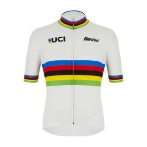 Depuis 1927, le vainqueur des Championnats du monde UCI porte le célèbre maillot blanc barré de cinq bandes colorées. En 1988, un partenariat historique a été scellé entre l’Union Cycliste Internationale (UCI) et l’équipementier italien Santini, qui fabrique depuis lors chaque maillot de champion du monde. De Bernard Hinault à Pauline Ferrand-Prévot, de nombreux champions et championnes ont donné une aura supplémentaire à cette tunique irisée.