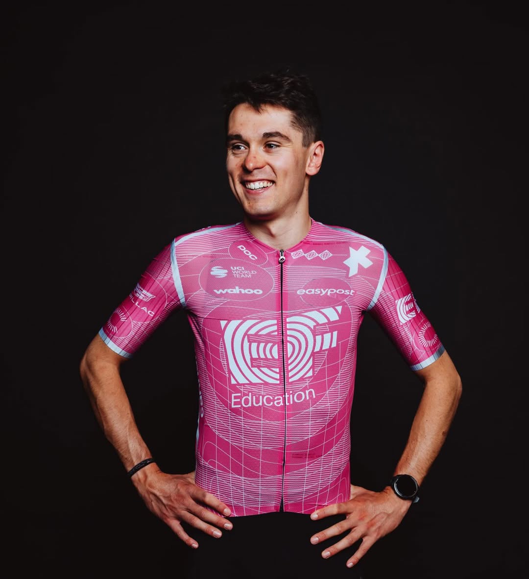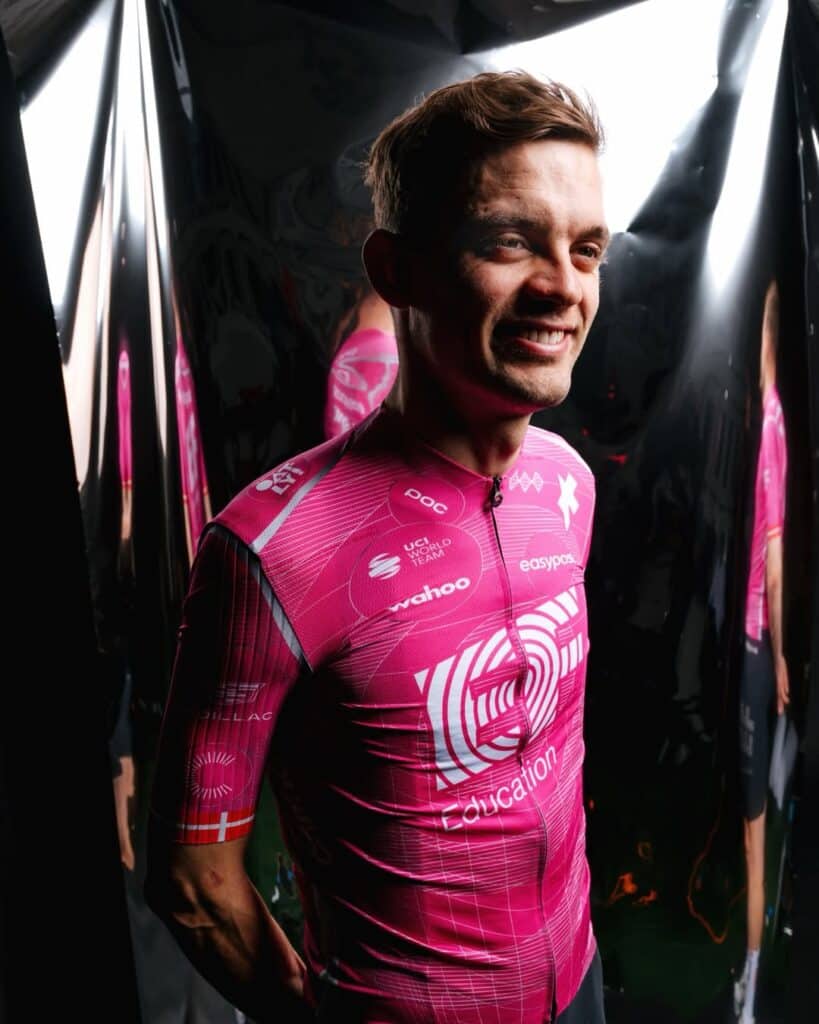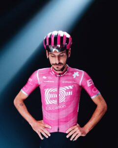 EF Education EasyPost conserve son rose emblématique pour 2026 mais lui donne une nouvelle lecture visuelle. Avec l’arrivée d’ASSOS, le maillot adopte un design plus structuré et moderne : un fond graphique travaillé, des motifs inspirés de l’exploration et de la découverte, et une approche visuelle pensée pour exprimer innovation et énergie nouvelle tout en restant immédiatement reconnaissable dans le peloton.