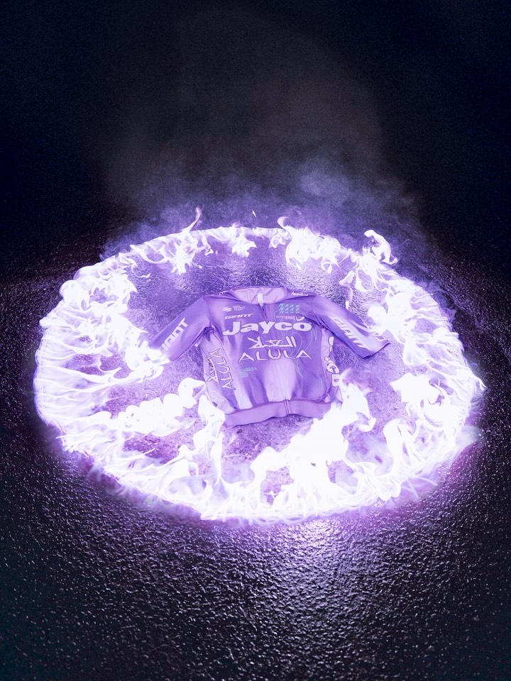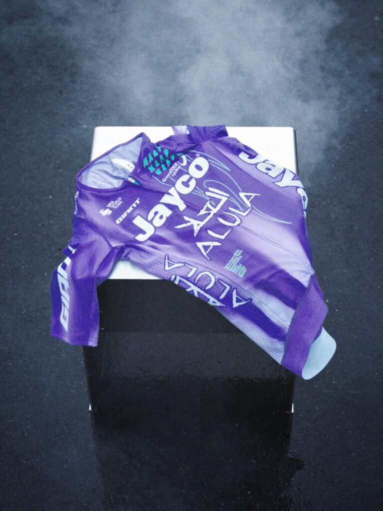 Le nouveau maillot 2026 de Jayco AlUla, signé MAAP, conserve la base violette introduite en 2025, devenue en très peu de temps un véritable marqueur d’identité visuelle de l’équipe dans le peloton. Cette couleur forte reste donc au cœur de la tenue, assumant une continuité graphique claire et reconnaissable.