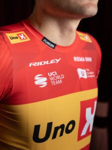 Le maillot 2026 d’Uno-X Mobility change peu visuellement : base rouge, large bande jaune, logo central et kit cohérent et très lisible, fidèle à l’identité forte de l’équipe. Mais derrière cette continuité graphique se cache une évolution majeure : l’apparition de la mention “UCI WorldTeam”, symbole de l’obtention de la licence WorldTour et de l’entrée officielle d’Uno-X dans l’élite mondiale, avec accès garanti aux plus grandes courses.